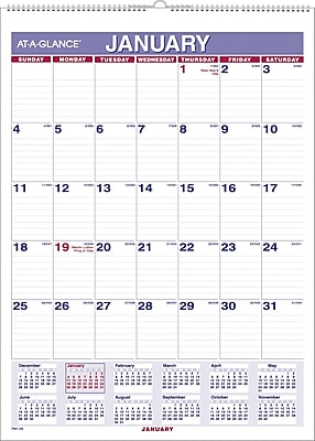 On this list, you will find such a calendar. It will print out onto a single page which you can use as a calendar. With and without holidays, blank and filled with dummy data.